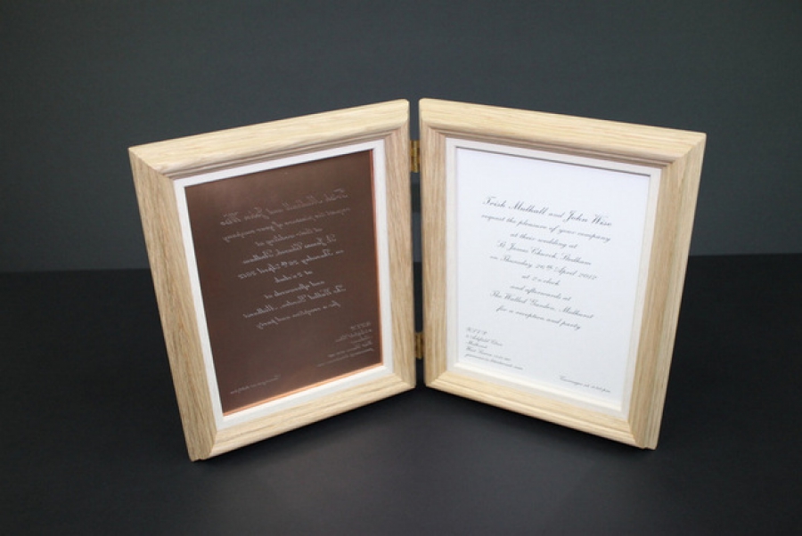 This was an unusual order from a customer as it is a copper printing plate with a copy of the printed material, which is a wedding invitation to the customer's wedding. Each side had an inner slip frame then a oak 'cathedral' profile was utilised for the outer frame. The two were hinged together using brass hinges.